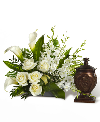 A warm and sophisticated ambiance can be created by using only white flowers and greenery in a floral arrangement. White flowers, regardless of their type, are symbolic of purity, which is why they are often chosen for funerals. Sometimes, expressing sympathy in a simple way is the most effective, and the recipient will appreciate the thoughtful gesture. The At Peace Arrangement by Teleflora is a soft and peaceful centerpiece that showcases unique Calla lilies, exotic Dendrobium orchids, and white roses that represent cherished memories. Trained florists carefully select the flowers, and same-day delivery is available through Teleflora's local florists in the United States and Canada. This arrangement is an ideal way to convey your emotions and demonstrate your condolences at a funeral.