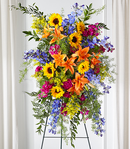 Flowers have always been a symbol of love, affection, and remembrance. They provide an ideal means of conveying your emotions and expressing your care for your loved ones. Our Sunlit Memories Standing Spray is an exquisite arrangement of fuchsia, deep blue, hot pink, and orange blossoms, meticulously crafted to commemorate the life of your dear one. This lively exhibit blends vivid hues with stunning texture, resulting in a distinctive and unforgettable homage.